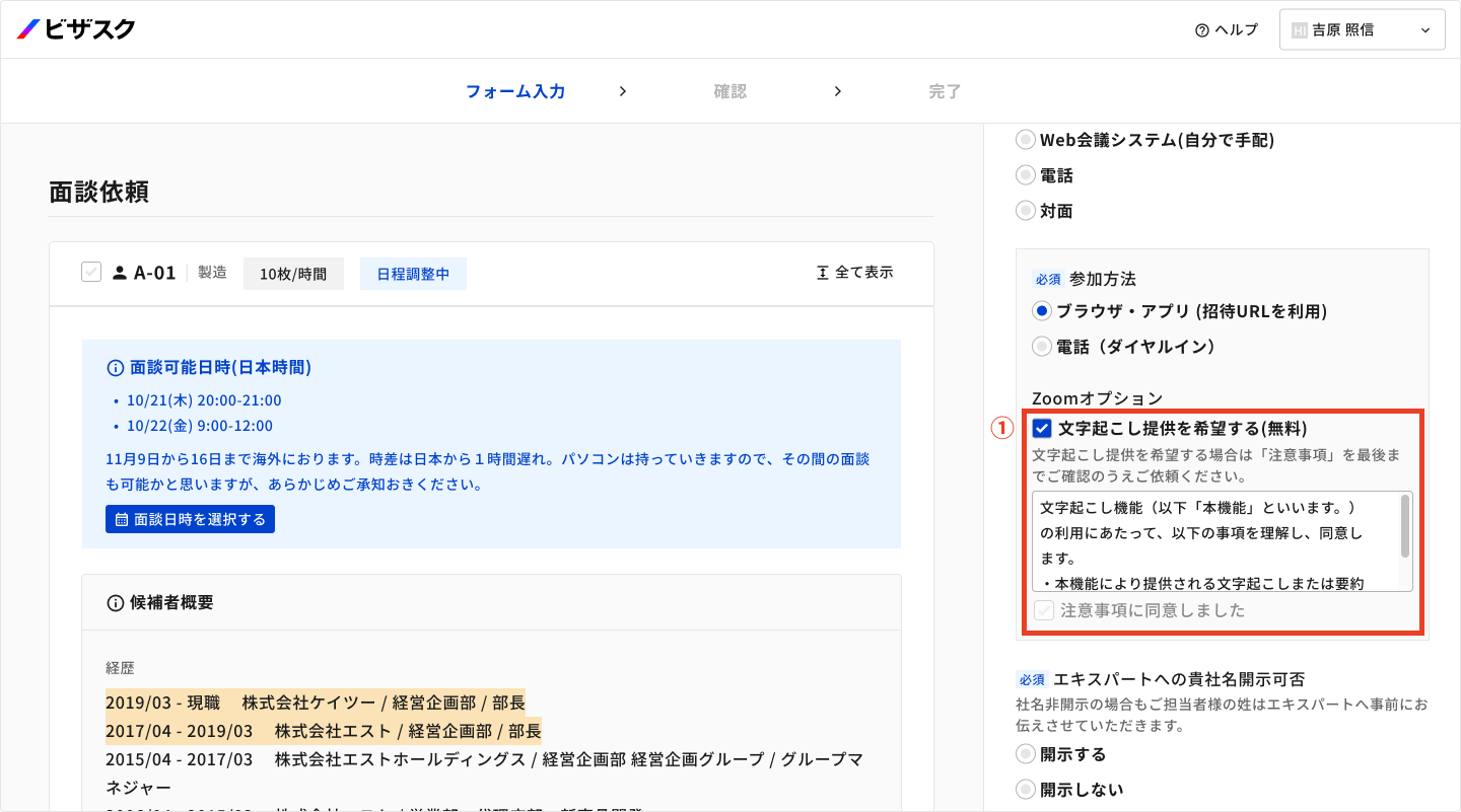 - ① インタビューの日程調整にて「文字起こし提供を希望する」を設定しておくと、